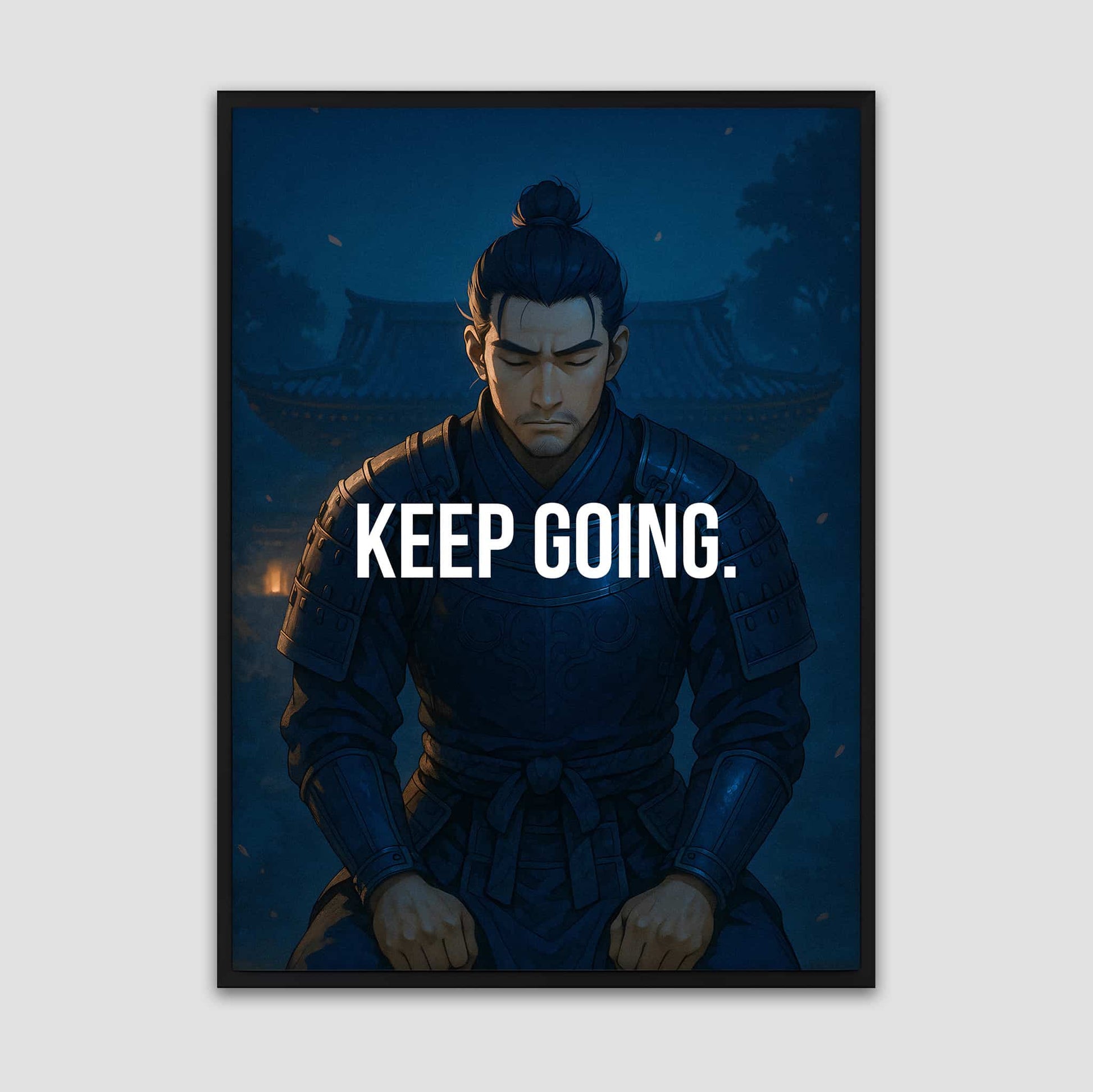A powerful motivational poster featuring an anime inspired samurai in a moment of calm determination. Perfect for any space where you need a reminder to stay disciplined and keep moving forward.