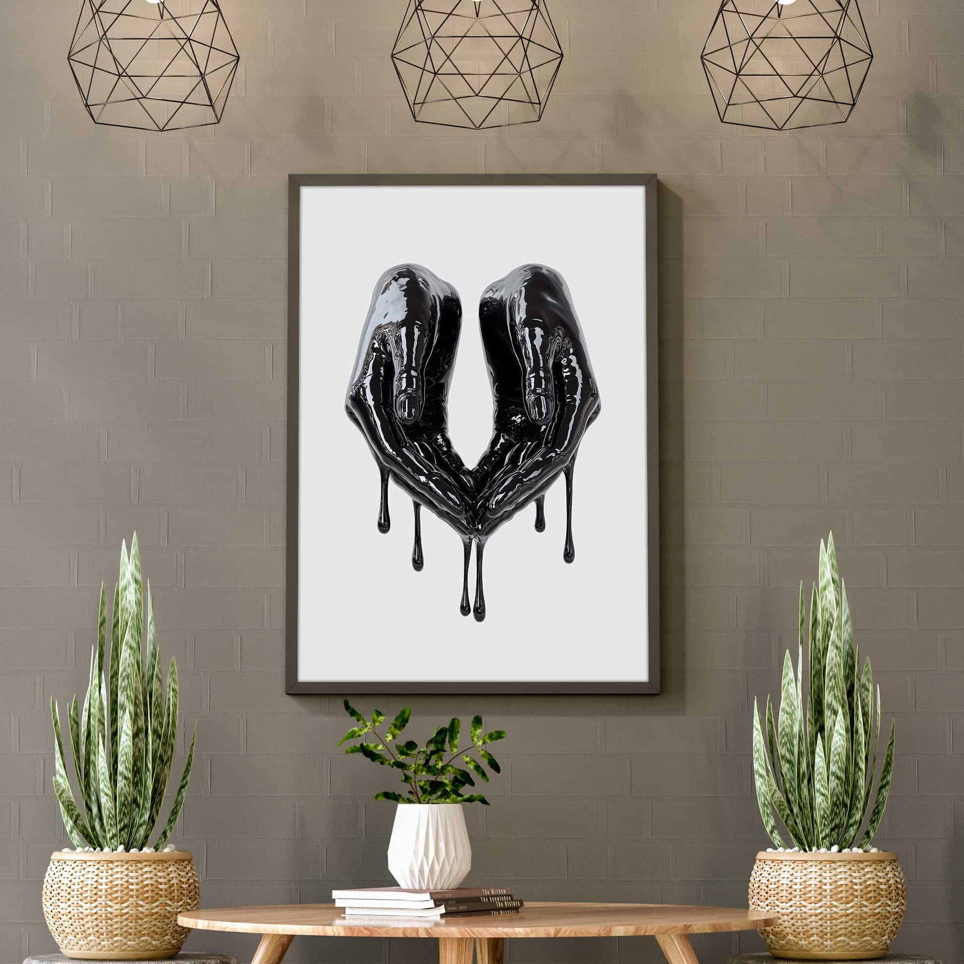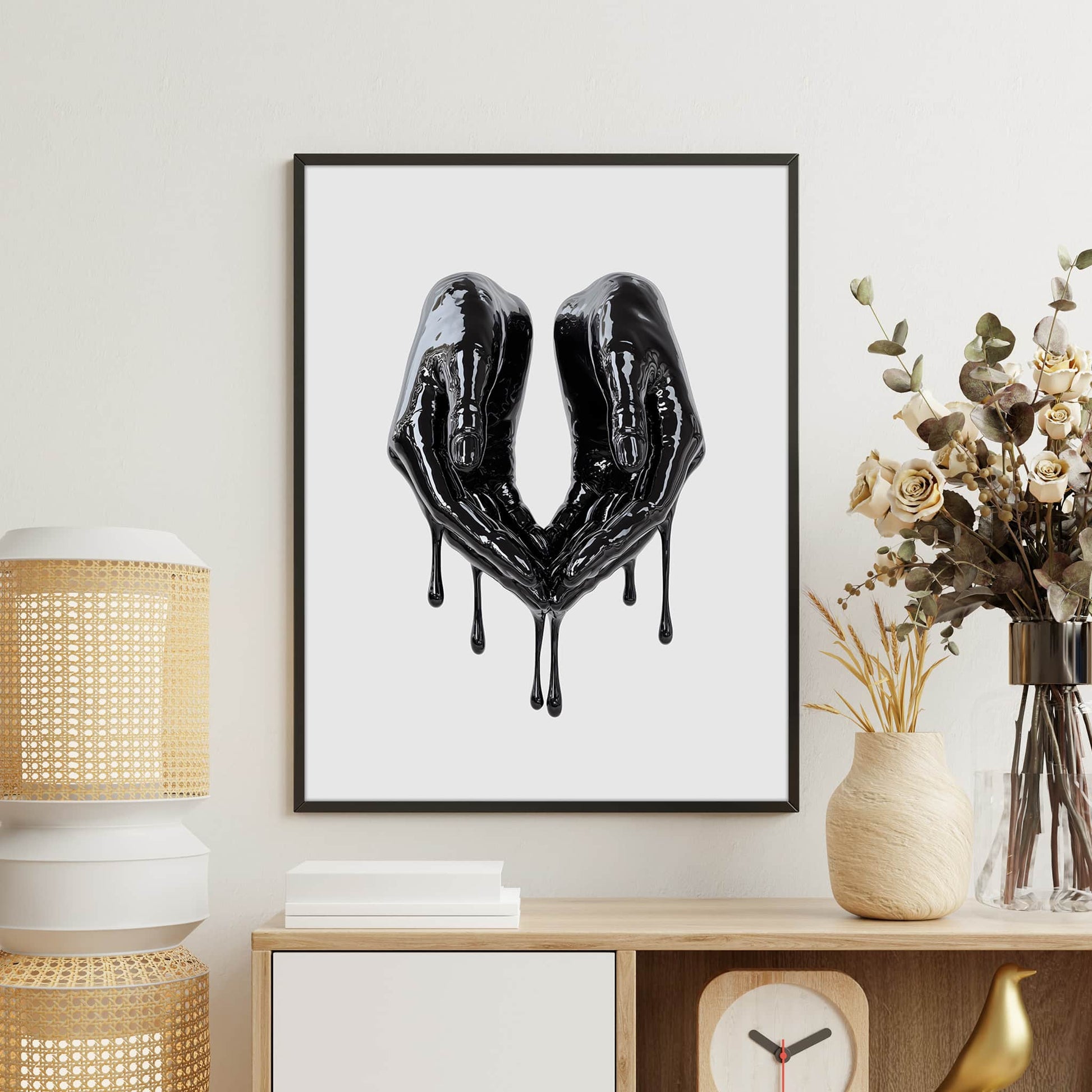 A bold poster featuring two glossy black hands forming a heart shape as they melt into dramatic drips. Perfect for bedrooms, studios, and contemporary spaces that embrace dark, stylish decor.