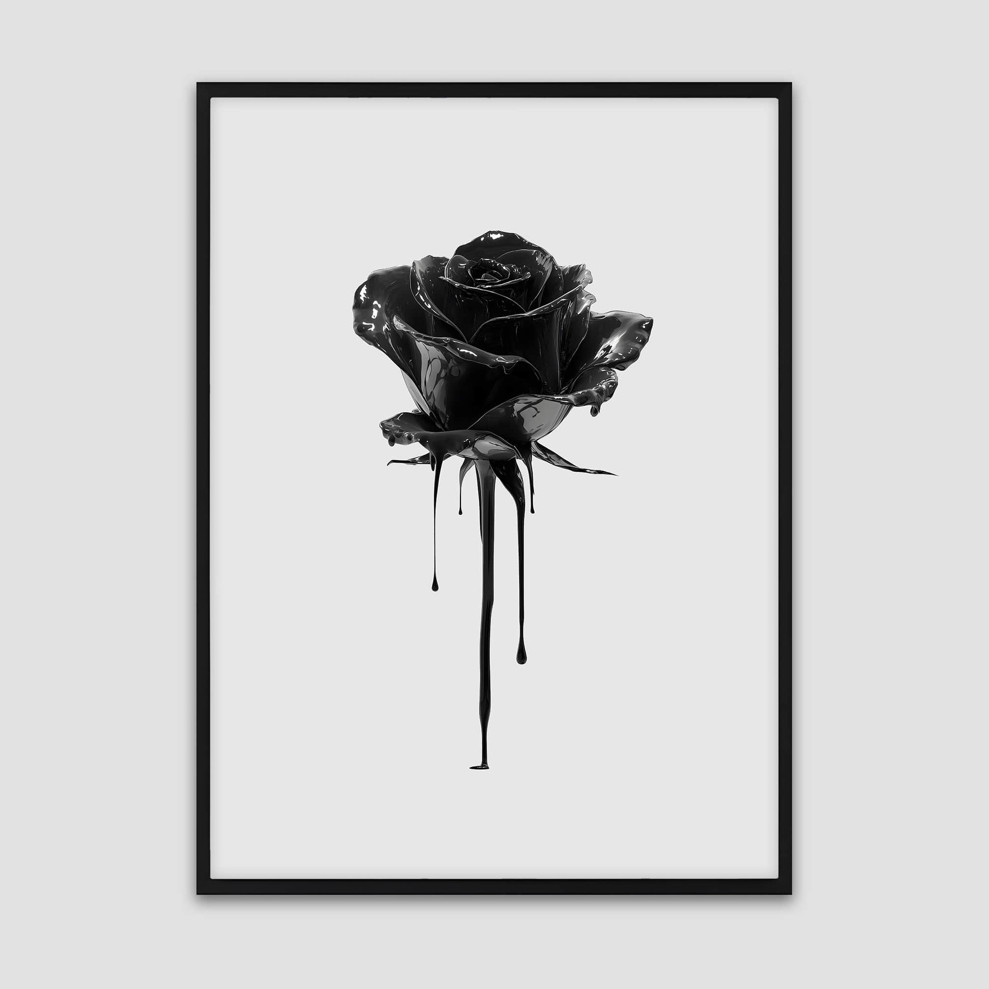 A minimalist poster featuring a glossy black rose that drips with dramatic elegance. Its bold contrast and artistic detail make it a powerful centerpiece for modern interiors. Perfect for bedrooms, studios, or anyone who loves dark, stylish wall art.