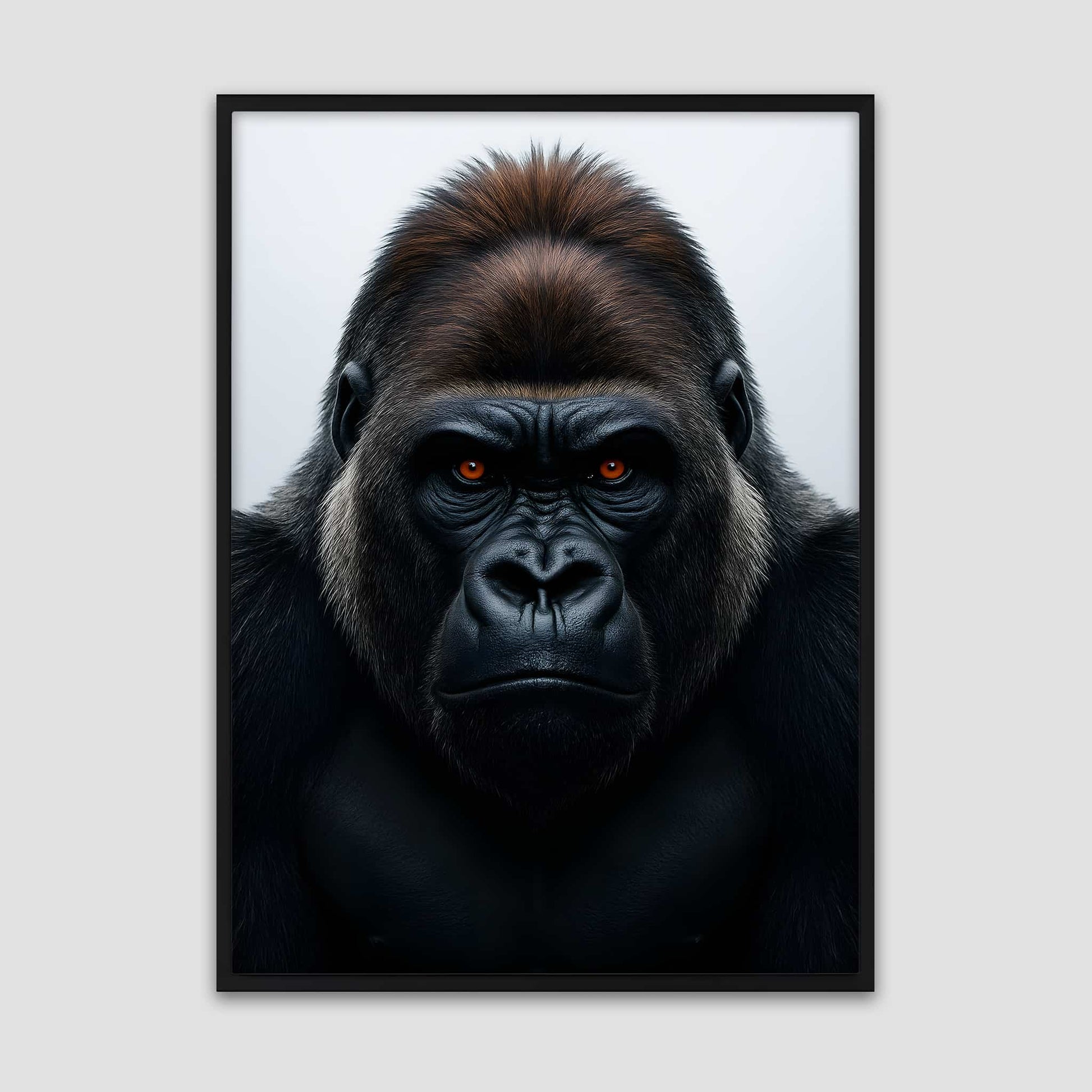 Close-up of a gorilla with sharp detail and deep expression. The simple composition and soft lighting give this wall art print a grounded and powerful look.