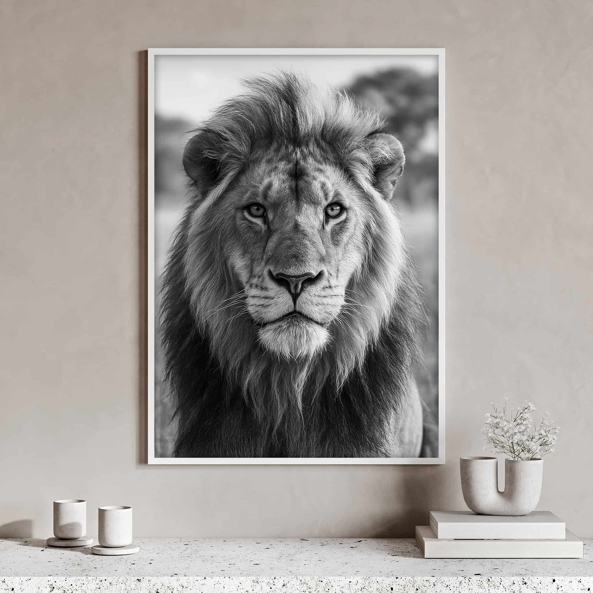 A detailed black and white lion poster with a calm, focused gaze. Bold wall art that adds character to your space.