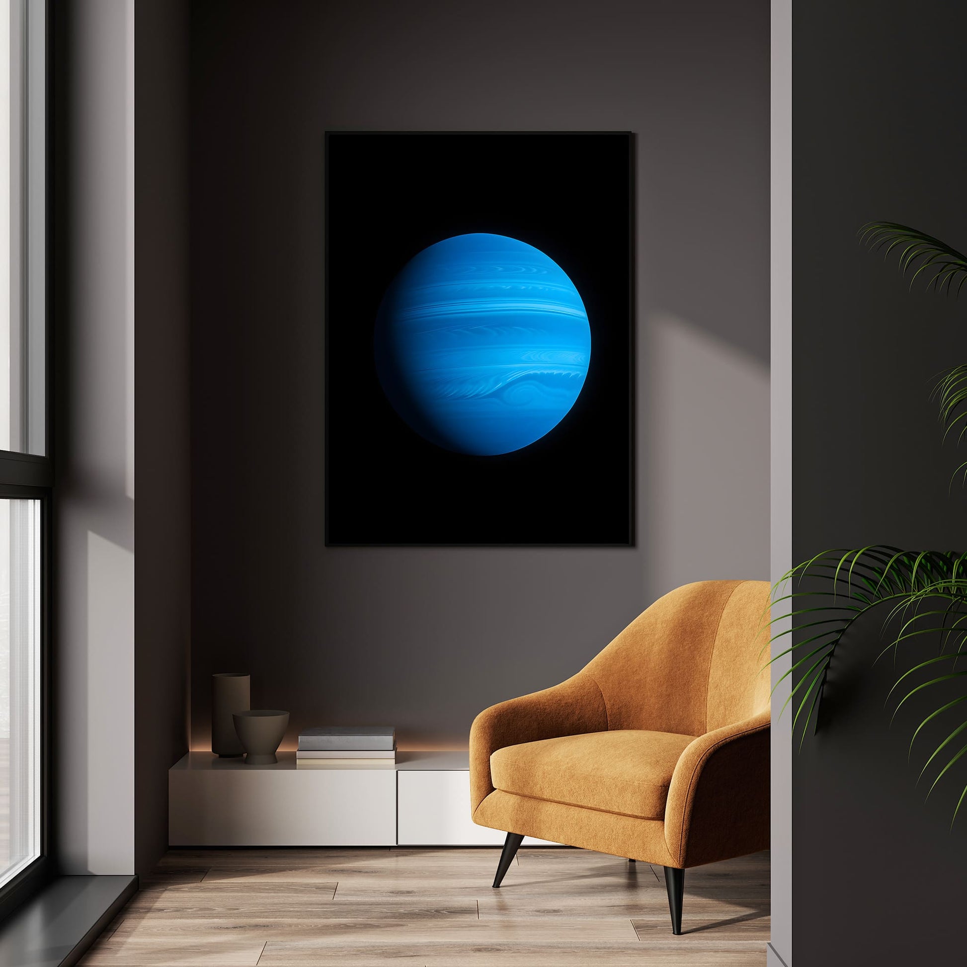 A deep blue view of Neptune with soft light and fine detail. This minimalist space poster brings a calm and mysterious feel to your room.