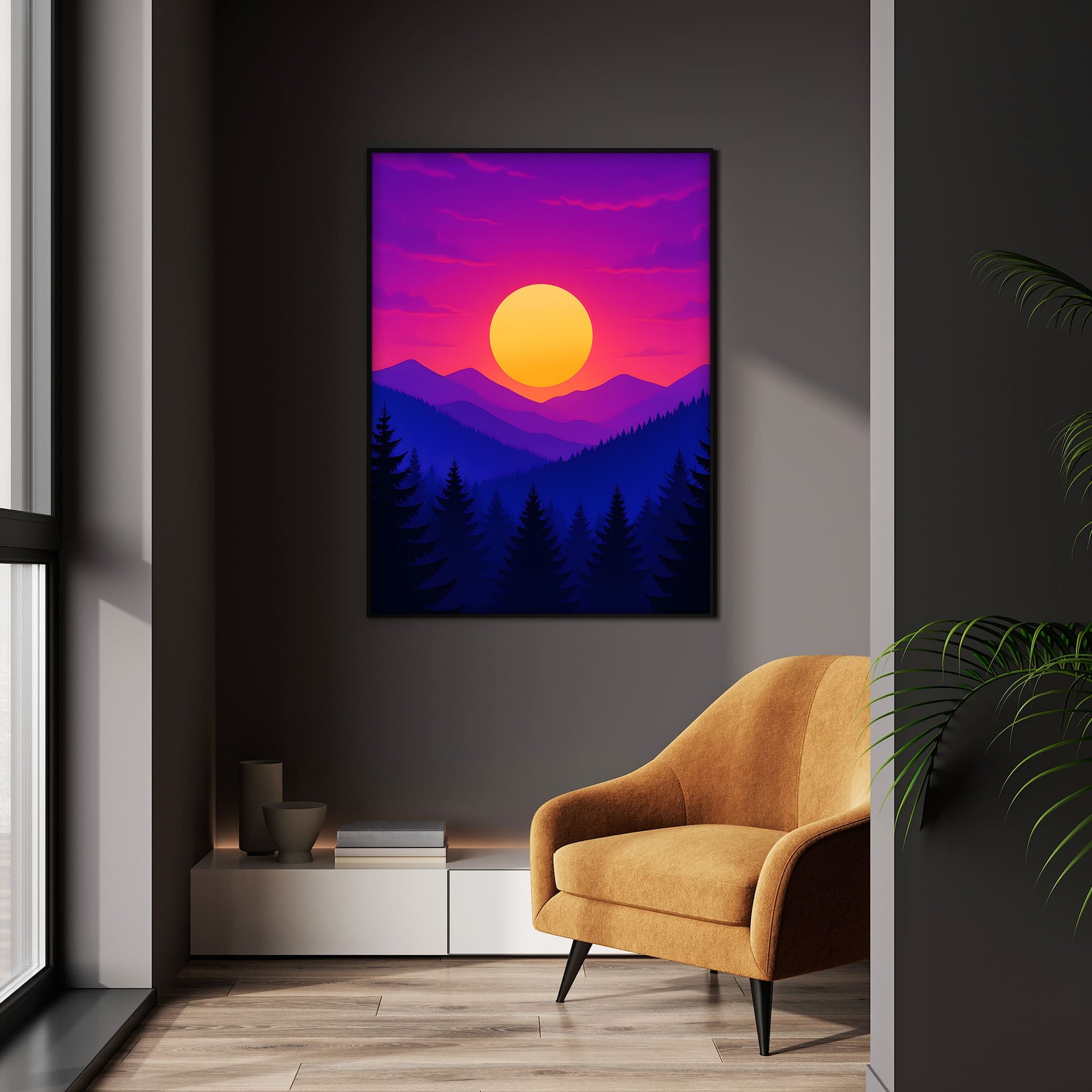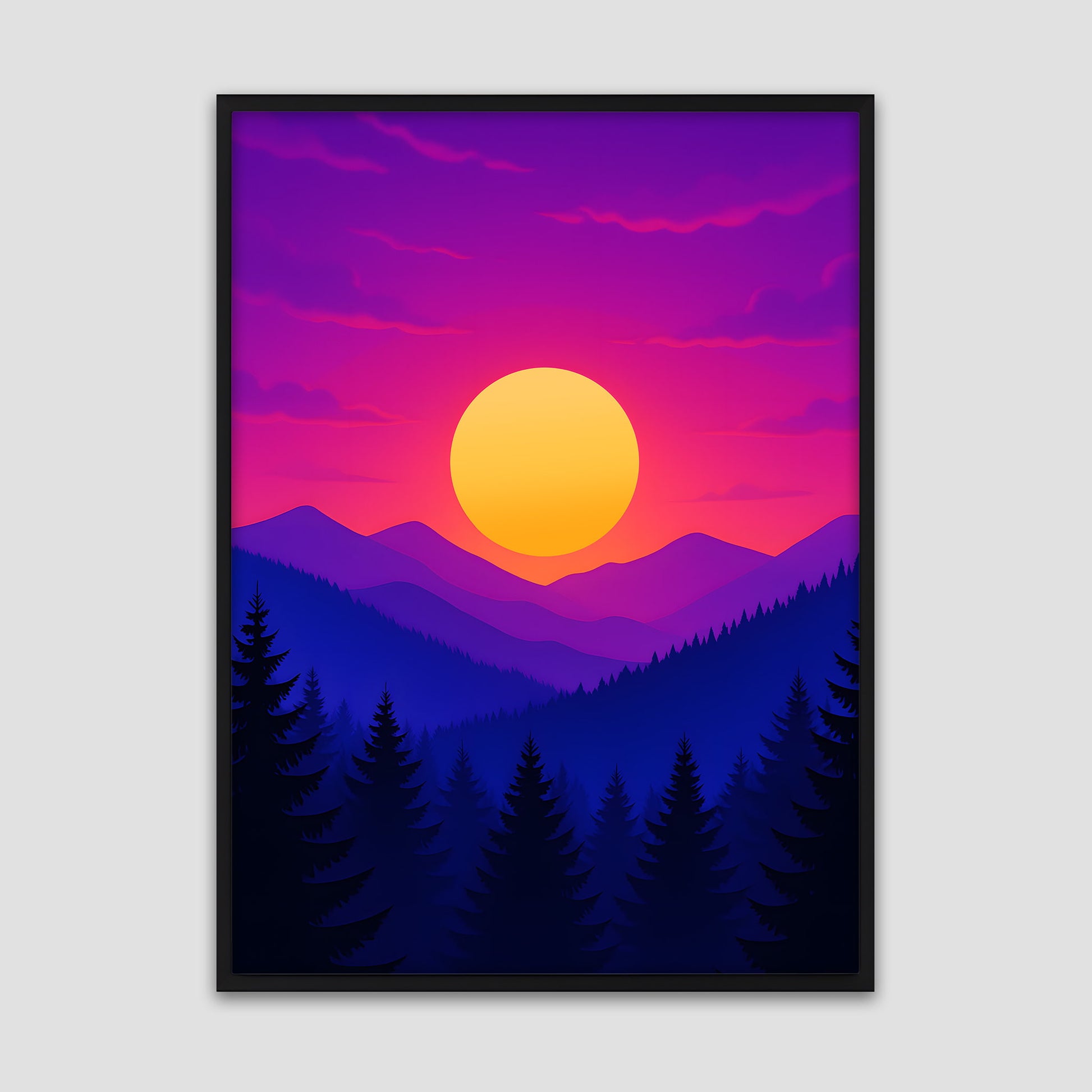 Vibrant shades of purple and orange frame a large setting sun over layered mountain ridges. The bold colors give this wall art print a warm and modern look.